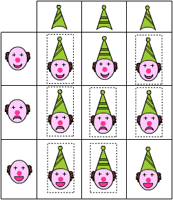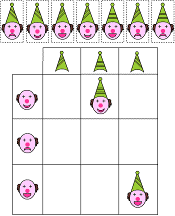 Recorta las figuras por las líneas punteadas. En la tabla pon cada payaso en donde estén su gorro y su cara, como en los ejemplos.