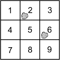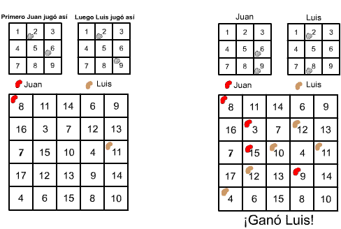 Material: dos tableros (como se muestra en la ilustración). Dos objetos pequeños (piedras, papelitos, etc), 30 frijoles (15 frijoles de un color y 15 frijoles de otro).
