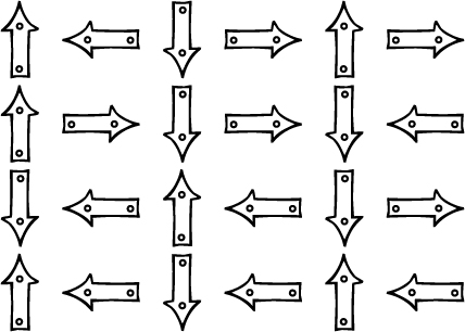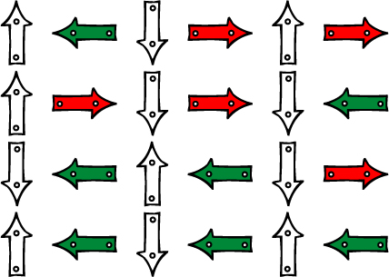 Pinta de rojo las flechas que señalan hacia la derecha y de verde las flechas que señalan hacia la izquierda.