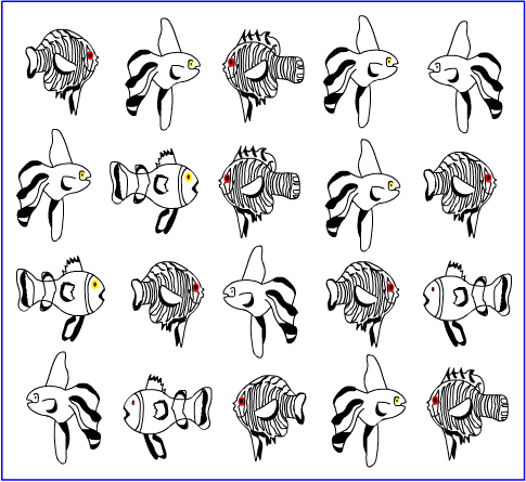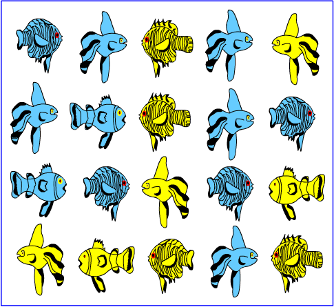 Colorea de azul los peces que están viendo hacia la derecha y de amarillo los que están viendo hacia la izquierda.