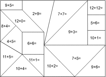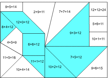 Haz las sumas y colorea las figuras donde el resultado es 12.
